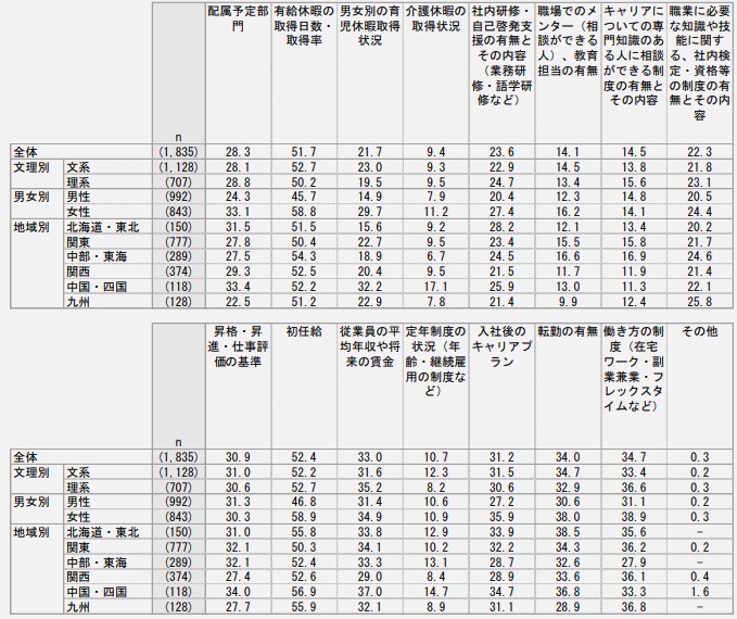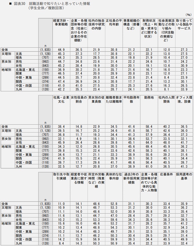 一方、学生の知りたい情報は最多の「勤務地」でも58.4%と6割に届かず、以下、「仕事内容」「初任給」「有給休暇」が5割台、「残業」「経営方針」「平均勤務年数」「社内の人間関係」が4割台を辛うじて維持。勤務地をはじめとする基本情報は重複するが、企業が積極的に発信する製品・サービスや社風・企業風土、応募条件、社内研修などへの学生の興味は薄い。
