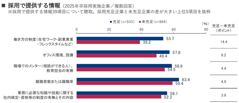ただ情報によっては、提供してはじめて学生の興味を引くものもある。採用充足企業と未充足企業に分けて情報別に採用での提供率をみると、在宅ワークや副業・兼業などの「働き方の制度」が充足企業53.7%、未充足企業39.2%で、最大の14㌽程度の差が生じた。以下の「オフィス環境、設備」も8.2㌽差と大きく、働き方や働く環境の説明が特に学生の心に刺さりやすいことを示唆している。