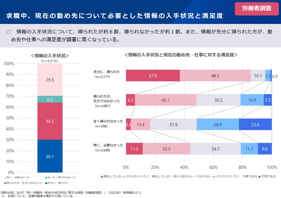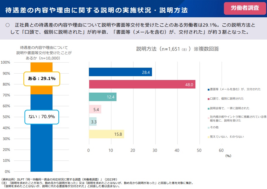 論点のうち、法14条で規定する「求めがあった労働者への待遇に関する説明義務」を強化する案が浮上した。説明されると勤め先・仕事に対する満足度が高まるが、説明を求める労働者が少ないことを調査で把握。主に労働者側委員から納得度をさらに向上させるべきだとして、「求めがあったとき」を削除すべきとの意見が多く出された。