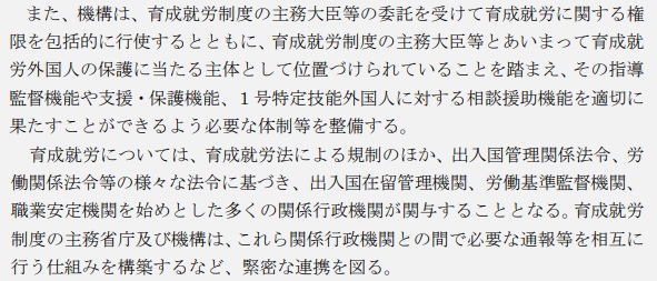 57条からは、外国人技能実習機構の後継組織となる外国人育成就労機構について定めた。1項では法と同様に、育成就労の適正な実施や育成就労外国人の保護、知識や経験を必要とする技能を有する人材の育成と確保が機構の目的であることを明記。設立や役員などの大枠は旧機構を踏襲し、86条までは文言の修正にとどめた。