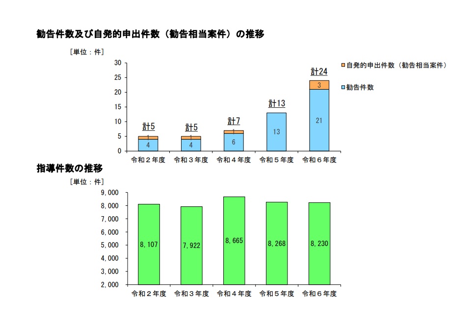 公正取引委員会は、2024年度に下請代金支払遅延等防止法違反で21件勧告したと発表した。前年度比8件増と平成以降の最多を更新。指導は同38件減の8230件だった。