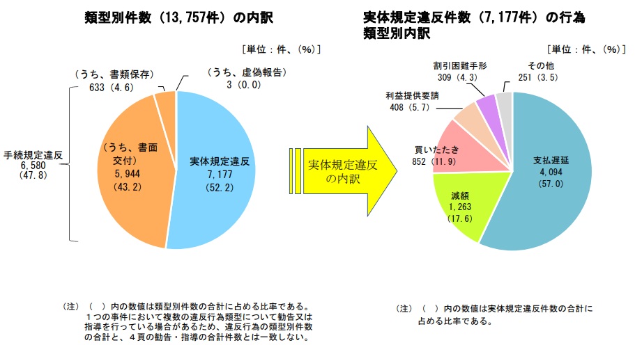 実体規定違反は「支払遅延」が57.0%、「減額」が17.6%、「買いたたき」が11.9%と多く、代金トラブルが上位を占める。