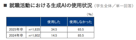 リクルート就職みらい研究所の「就職白書2025」によれば、25年大学・大学院卒の就職活動での生成AI使用率は34.5%で、前年比20.0㌽増と大幅に上昇。
