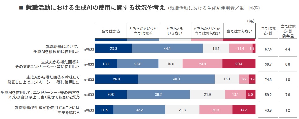 使用の考え方では「積極的に使用」が67.4%となり、「使用に不安」の43.9%を大きく上回る。エントリーシートなどに関しても「AIの回答を吟味して修正した上で使用した」が同1.0㌽増の74.8%で最も高いが、「AIを使用して内容を本来の自分以上に良くみせても良いと思う」が同7.6㌽増の59.2%、「AIから得た回答をそのまま使用した」も同8.6㌽増の39.7%と大幅に増えた。