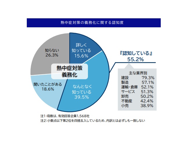 6月から罰則付きで義務化された熱中症対策について、5月上旬時点の認知度が55.2%だったことが1568社を対象にした帝国データバンクの調査でわかった。