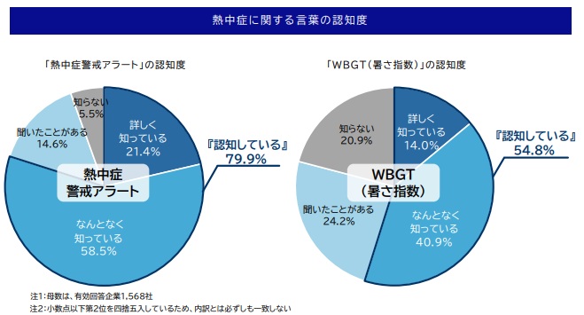 なお熱中症に関する言葉の認知度も尋ねたところ、「熱中症警戒アラート」が79.9%、「WBGT(暑さ指数)」は54.8%となっている。