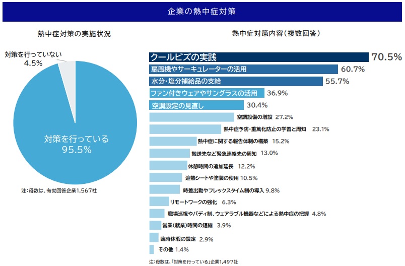 熱中症対策について、何らかの対策を行っている企業割合は95.5%。実施した対策を問うと「クールビズの実践」が70.5%、「扇風機・サーキュレーターの活用」が60.7%と予防対策が上位を占めた。これに対し、義務化した報告体制の構築、緊急連絡先の周知などは1割台だった。