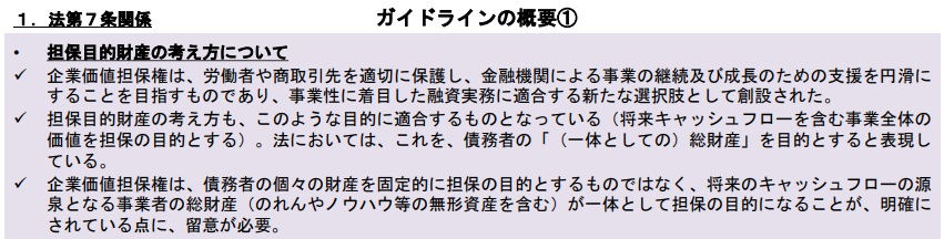 不動産などの有形資産に乏しいスタートアップや中小企業へ金融機関の融資を促進するため、のれんやノウハウといった無形資産を含む事業者の総財産を担保とする企業価値担保権を創設。来春を予定する事業性融資推進法の施行に向けて、特に労働者保護に関する留意事項についてガイドラインで示している。