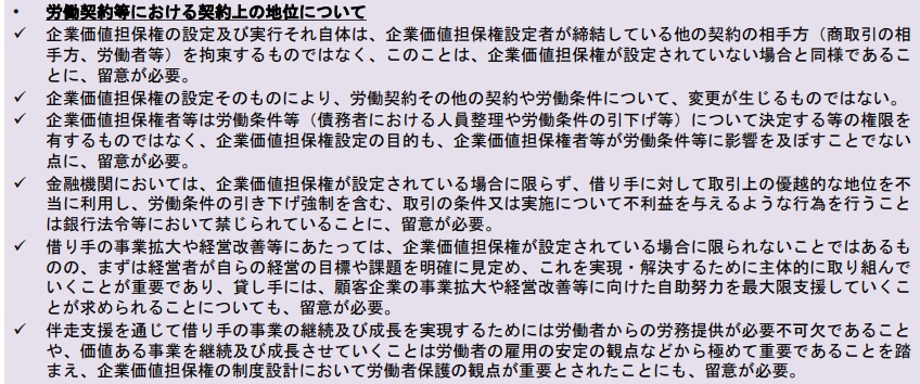 まず企業価値担保権の設定や実行自体に関し、商取引の相手方や労働者を拘束せず、労働契約や労働条件などに変更が生じないと整理。企業価値担保権者は、債務者における人員整理や労働条件の引下げなどの決定権限を持たず、労働条件に影響を及ぼすことが企業価値担保権設定の目的でもないと明記した。