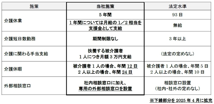 また介護短日数勤務を期間制限なく利用を認めたほか、介護休暇の取得日数を被介護者1人で年12日間、2人以上で年24日間と法定を上回る形で制度化。相談窓口も社内・社外に設置し、新たに扶養する被介護者1人につき月3万円の独自の手当の支給も開始した。