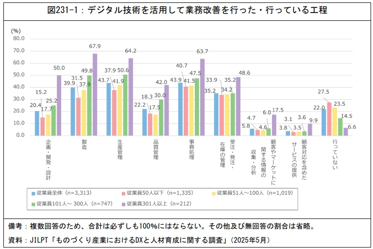 ものづくり産業の8割弱がデジタル技術を活用した業務改善に取り組んでおり、工程別では「事務処理」「生産管理」「製造」の順で実施率が高く、約9割が「効果を感じる」と回答。