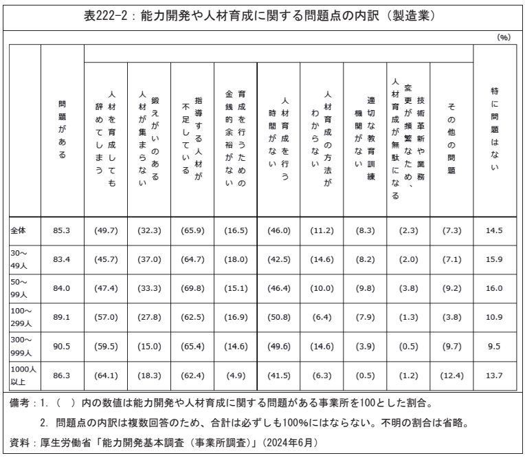 一方、能力開発や人材育成にて「問題がある」事業所は85.3%と全産業平均を上回り、具体的には「指導人材の不足」「育成しても辞める」「育成の時間がない」に対する問題意識が高かった。
