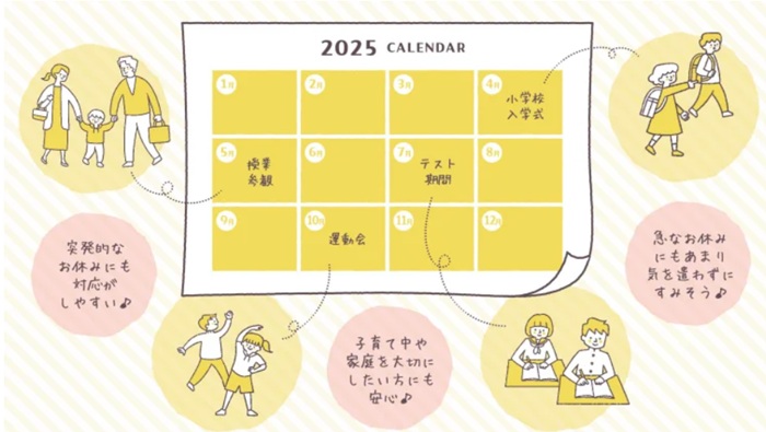 急な家族の事情で休む従業員とシフトを代わった者を評価する「バトンタッチ制度」、従業員の学校行事などを共有する「イベントカレンダー」の掲示で柔軟な働き方を推進。