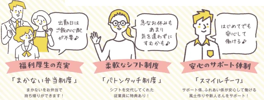 また店主をサポートするアルバイトから「スマイルチーフ」、新人をケアする「サポート係」を任命するほか、仕事後に弁当を持ち帰る「まかない弁当制度」も新設する。