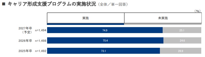 リクルート就職みらい研究所の「就職白書2025」によると、26年大学・大学院卒向けのプログラムの実施率は前年度比2.2㌽増の75.4%に上昇。実施目的と得た成果はともに、「自社を含む業界・仕事の理解の促進」「入社意欲の高い学生の絞込み」「採用を意識した学生のスキルの見極め」の順で高く、業界全体を視野に入れつつも企業が採用を意識してプログラムを実施したことを示した。