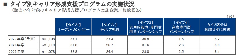 採用ルールで定義するタイプ別のプログラム実施率は、タイプ1「オープンカンパニー」が同4.9㌽増の87.8%と突出しているが、次位にはタイプ3「汎用的能力・専門活用型インターンシップ」が同3.6㌽増の31.6%で続いた。