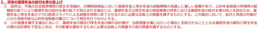 基礎年金の底上げ措置は、2029年の次期財政検証で給付水準の低下が見込まれる場合に、マクロ経済スライドの早期終了で措置する。財源は厚生年金の積立金と国庫負担で充当することになるが、具体的な記述は回避。厚生年金受給額の一時的な減額、国費の捻出方法など山積する課題を先送りにした格好だ。