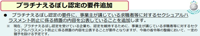 女性活躍推進の取組みが特に優良な事業主に対する特例認定制度「プラチナえるぼし」について定める12条では、男女雇用機会均等法の改正に合わせて当該認定基準を見直す。均等法で新たに義務化する性的な言動による求職者の求職活動を阻害する行為、つまり就活等セクシュアルハラスメントについて、防止措置などの情報の公表を認定基準に加える。