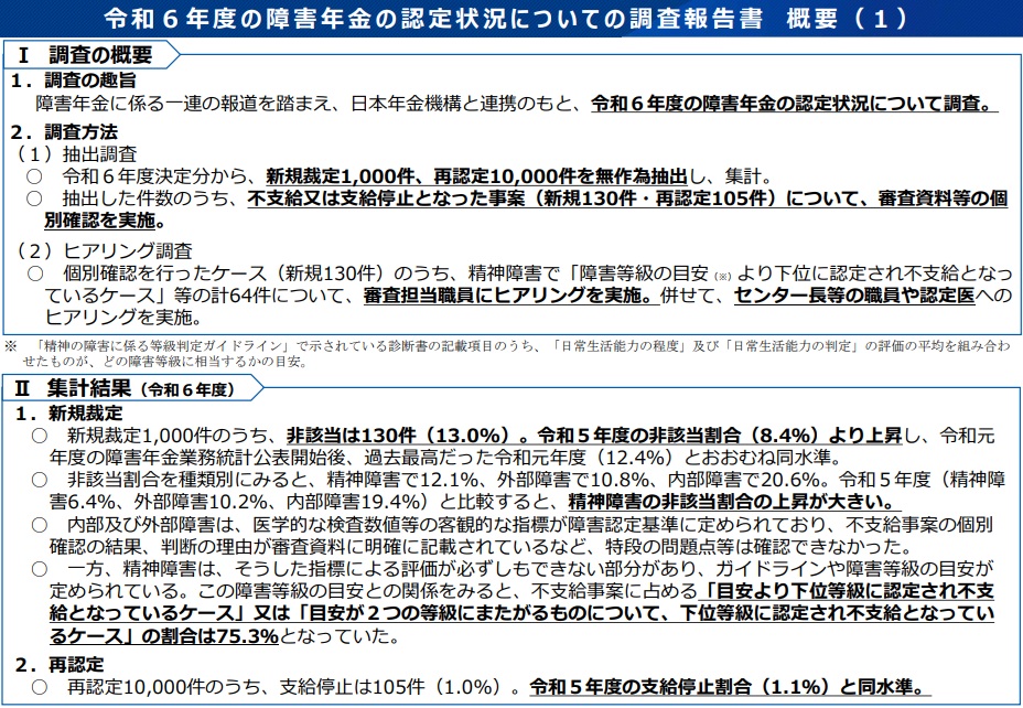 厚生労働省はこのほど、不支給の増加が指摘される障害年金の2024年度認定状況の調査報告を公表した。
