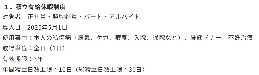 エイチ・アイ・エス(東京都港区)は5月から、「積立有給休暇」制度を新設した。失効した年次有給休暇を年10日まで3年を限度に最大30日積立てて、自身の私傷病や不妊治療、骨髄ドナーに後日まとめて利用できる。