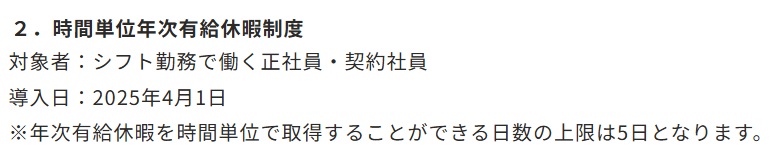 また新年度から、シフト勤務で働く者を対象にした「時間単位年休」制度を導入し、年5日分の年休の1時間単位の取得を認める。