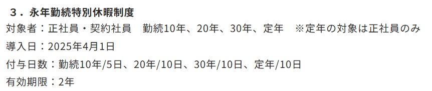 さらに勤続10年に5日、勤続20・30年と定年時に10日の有給休暇を付与する「永年勤続特別休暇」制度を再導入。有効期限は2年で、中断していたコロナ禍で対象となった者にも今年付与するなど長年の貢献を讃える。