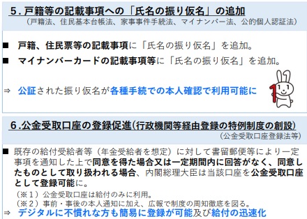 戸籍法の一部改正を含む「マイナンバー法等の一部改正法」が5月26日に施行された。戸籍の記載事項として、戸籍法13条1項2号に「氏名の振り仮名」を追加。行政のデジタル化推進のため、データ検索を容易にするとともに、氏名のフリガナを戸籍上特定し、行政が公に証明することで、本人確認の資料として利用できるようにする。