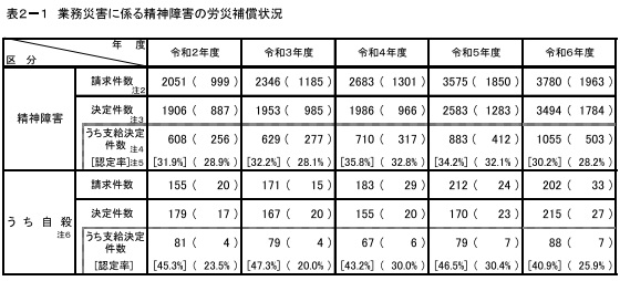 厚生労働省がこのほど発表した2024年度過労死等労災補償状況で、精神障害と脳・心臓疾患の労災請求・認定がともに最多を更新。制度の認知の浸透もあるが、精神の労災認定が初めて1千件を超えており、職場環境が悪化している可能性が懸念される。