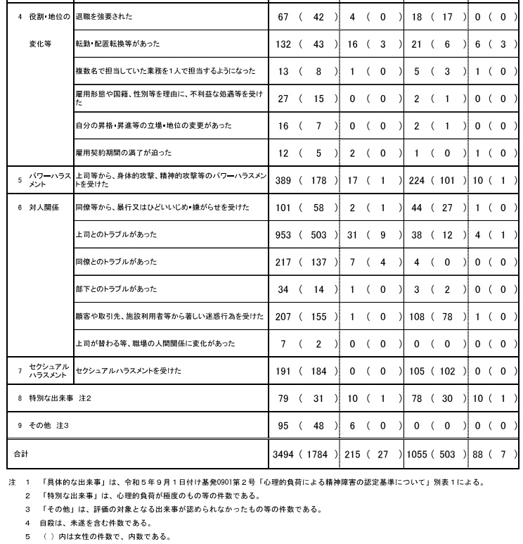 認定を具体的な出来事別にみると、「上司等から身体的・精神的攻撃等のパワハラを受けた」が同67件増の224件で突出しているが、「セクハラを受けた」も同2件増の105件と3桁を維持した。またカスハラを想定する「顧客や取引先、施設利用者等から著しい迷惑行為を受けた」と「顧客や取引先から対応が困難な注文や要求等を受けた」を合わせた件数も、同55件増の118件に急増。合計件数が認定総数の42.4%を占めるなど、想像以上に職場でハラスメントが横行しており、多くの労働者を苦しめている実態が浮き彫りになった。