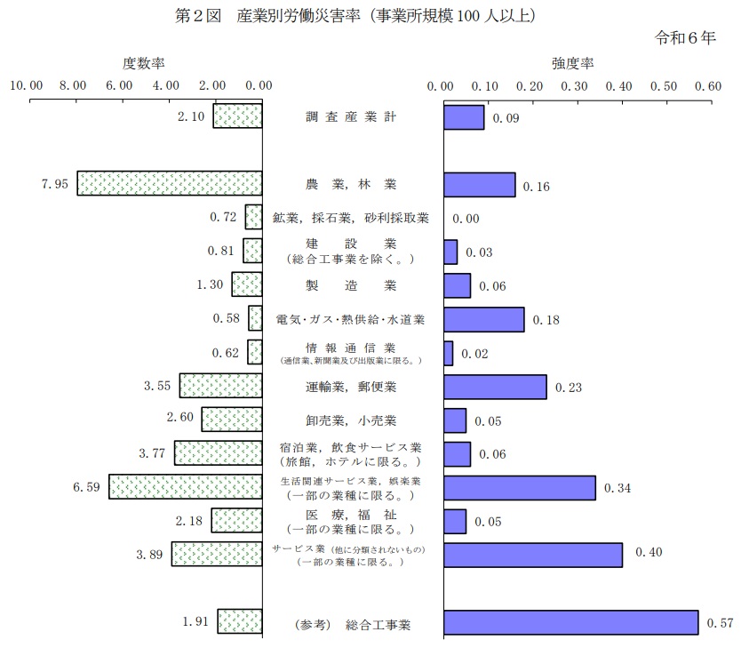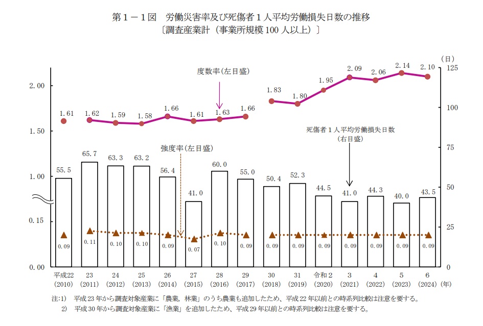 100人以上規模事業所の労働災害の発生頻度を表す度数率が前年比0.04㌽減の2.10と2年ぶりに低下したことが、このほど厚生労働省が発表した2024年の労働災害動向調査でわかった。