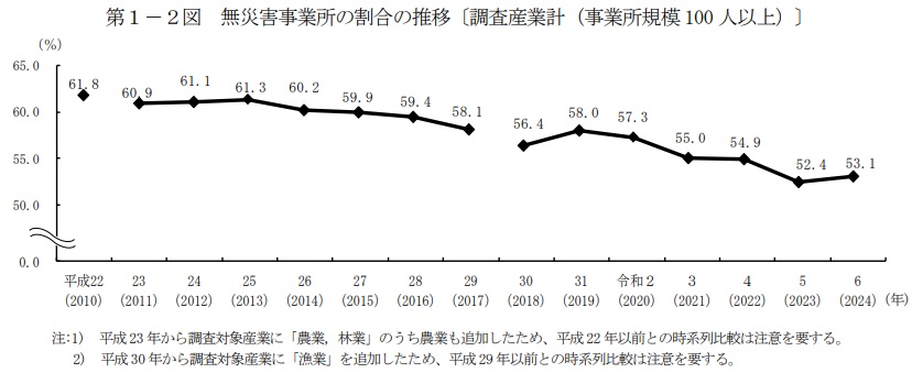 災害の重さを表す強度率は0.09と横ばいだが、無災害事業所率は同0.7㌽増の53.1%と5年ぶりに改善。一方、死傷者1人平均労働損失日数は同3.5日増の43.5日と2年ぶりに増加した。
