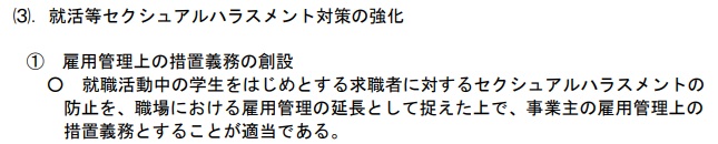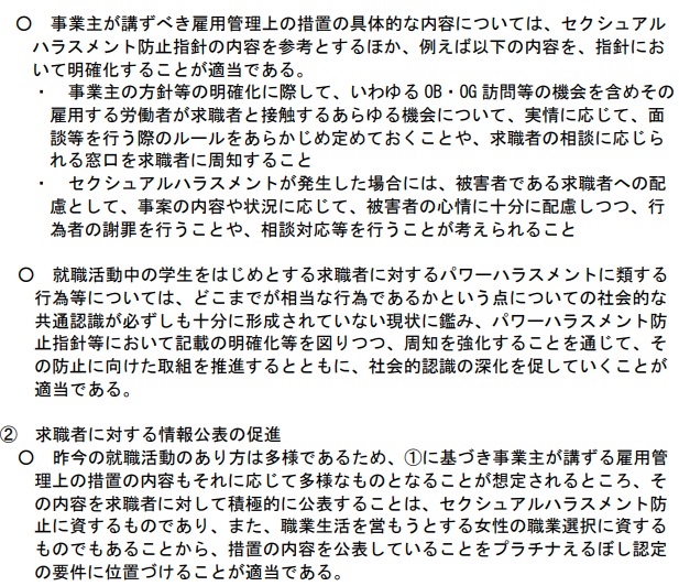 例えば指針には、事業主の方針等の明確化に際して「OB・OG訪問を含めて労働者と求職者が接触する場合のルールをあらかじめ定めておき、相談窓口を設置して求職者に周知すること」「セクハラ被害者である求職者へ心情に十分に配慮しつつ行為者の謝罪を行うこと、相談対応を行うこと」などを示す考えだ。