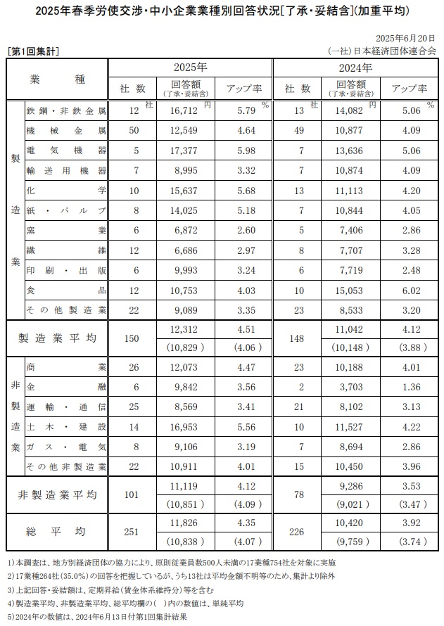 経団連はこのほど、2025年春季労使交渉の中小企業回答状況第1回集計を公表した。