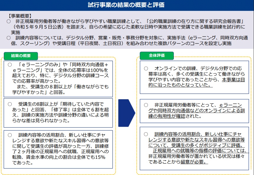 厚生労働省はこのほど、非正規雇用労働者が働きながら学びやすい職業訓練事業の本格実施に向けた案を公的職業訓練の在り方に関する研究会に提示した。
