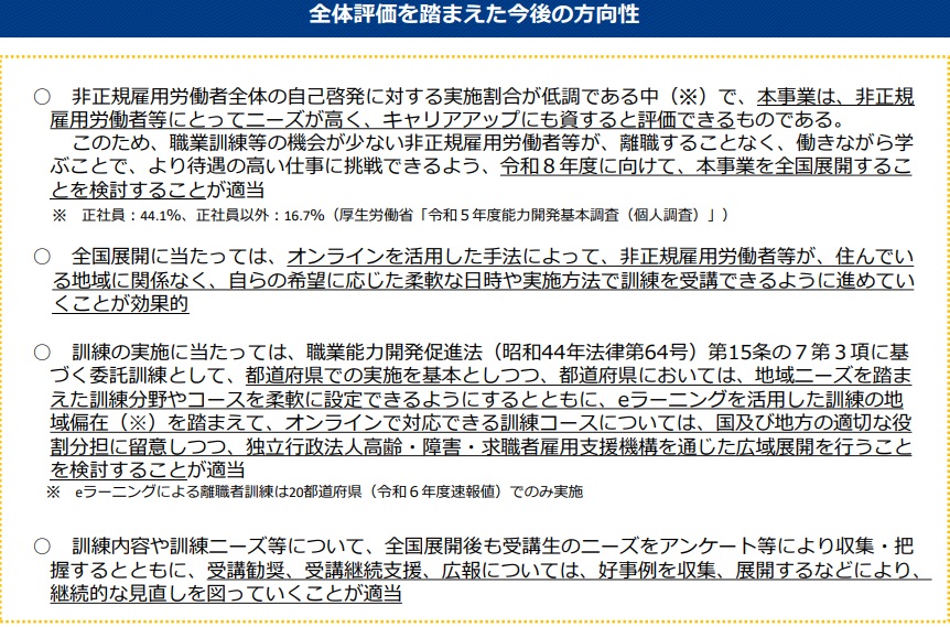 試行実施中の非正規向け在職者訓練に関し、2026年度の全国展開を視野に入れた制度設計を示唆。都道府県が地域ニーズを踏まえた訓練分野・コースを設定する一方で、高齢・障害・求職者雇用支援機構が柔軟な受講を可能とするオンライン訓練の広域展開を担うよう役割分担を求めた。
