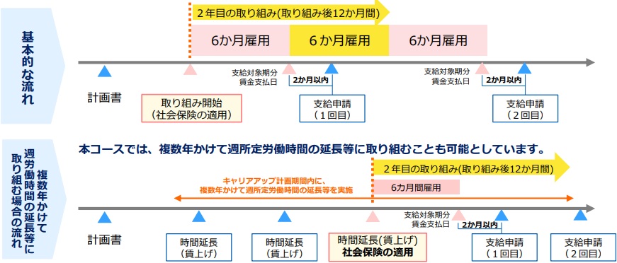 社会保険加入日の前日までに、都道府県労働局へキャリアアップ計画書を事前に提出することが必要で、1年目の第1期、2年目の第2期の取組みごとに助成金を支給する。取組み期間は原則1年だが、第1期に関しては複数年かけて行うことも可能とする。