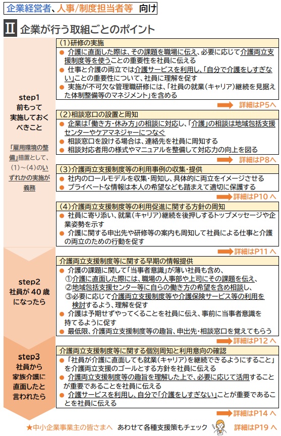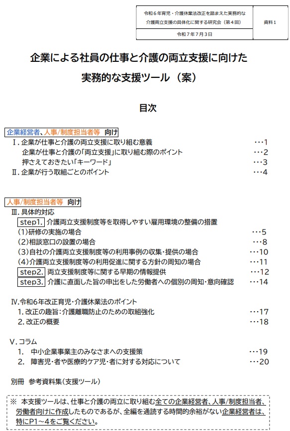 支援ツールは、企業経営者をはじめ企業の人事・制度担当者、労働者といった全ての関係者を対象に想定し、介護支援に必要となる取組みや好事例、留意点を盛り込む形で作成。全体で20ページのボリュームだが、通読の時間的余裕がない企業経営者向けに冒頭の4ページを割き、簡便な概要版も作成した。