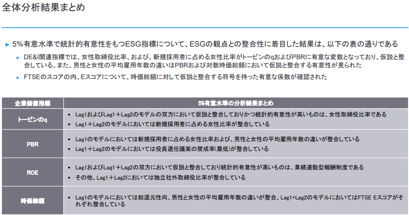 検証の結果、女性取締役比率や新規採用者に占める女性比率という多様性に関する指標が、企業価値(トービンのq)の数値やPBR(株価純資産倍率)に統計的に有意な正の影響を与えている、などの内容が示されている。