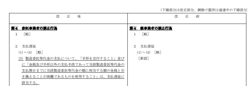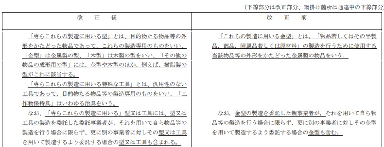 このほか、新たに禁止される手形払が支払遅延に該当することを明示。さらに不当な経済上の利益の提供要請に関し、製品作成に用いる「木型、治具」などが金型と同様に製造委託の対象物となることも追記する。