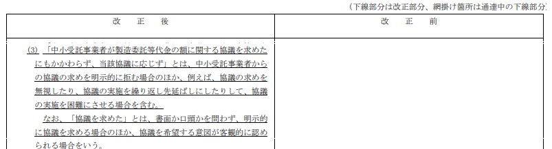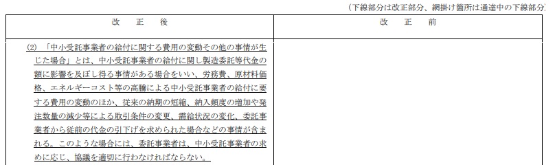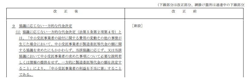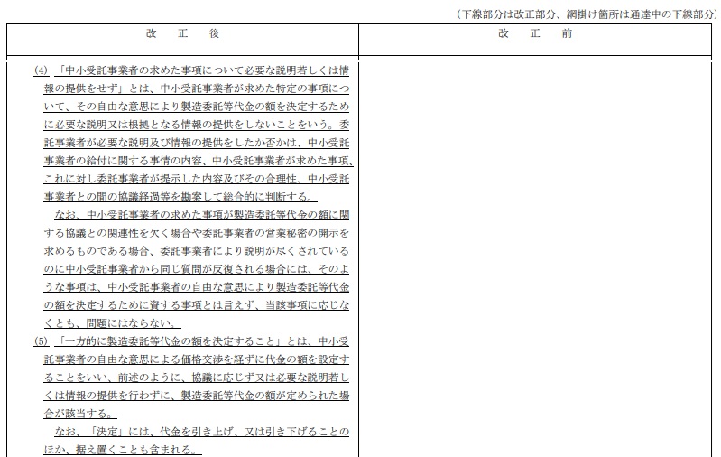 一方的な代金決定についても、「中小受託事業者との価格交渉を経ない代金の額の設定」を指し、決定には引上げ・引下げはもちろん、「据置きも含む」と厳格化している。