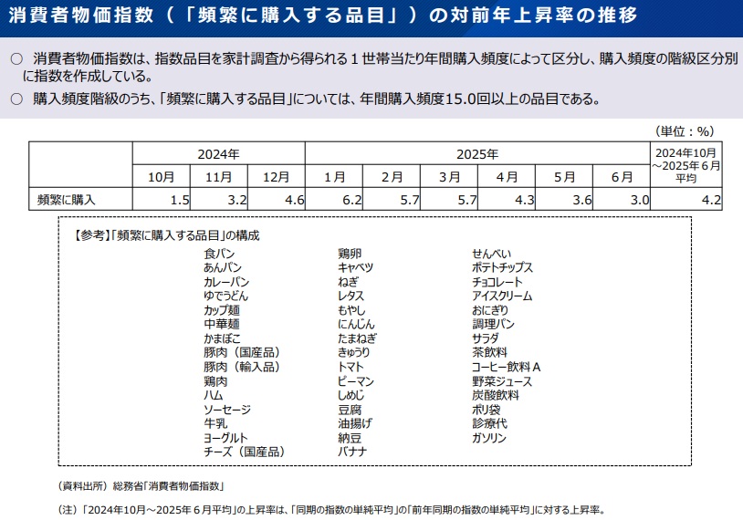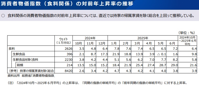 最低賃金改定3要素のデータをみると、労側が重視する「労働者の生計費」に関しては、24年10月から今年6月までの消費者物価指数の上昇率の平均が「持家の帰属家賃を除く総合」で3.9%、生活必需品を含む「頻繁に購入する品目」で4.2%と高止まり。特に「食料品」は6.4%で、うち「生鮮食品」は9.8%、生鮮以外の「穀類」は21.6%まで跳ね上がり、最低賃金近傍で働く者の生活苦の可能性を如実に示す。