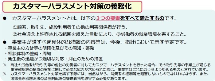 顧客や取引先、施設利用者などの社会通念上相当な範囲を超えた言動により職場で労働者の就業環境を害する、いわゆるカスタマーハラスメントの規定は公布1年半後に33条と34条を施行する。