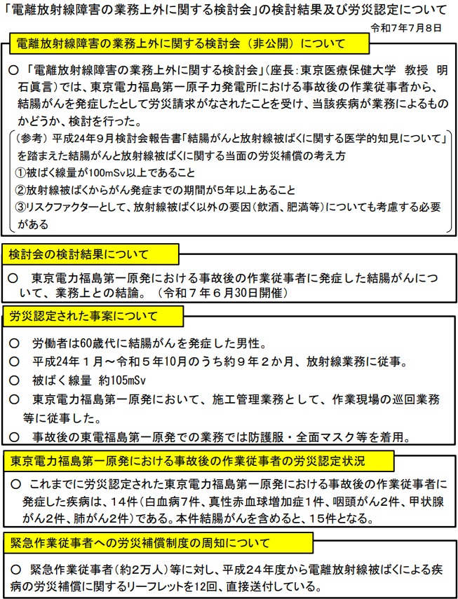 電離放射線障害の業務上外に関する検討会が6月30日に「業務上」と判断したのを受けて、東京労働局三田労働基準監督署が7月4日付けで労災認定した。
