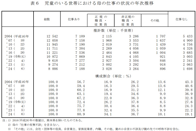 厚生労働省の2024年国民生活基礎調査で、18歳未満の児童のいる世帯の母の「仕事あり」割合が前年比3.1㌽増の80.9%で初めて8割を超えた。