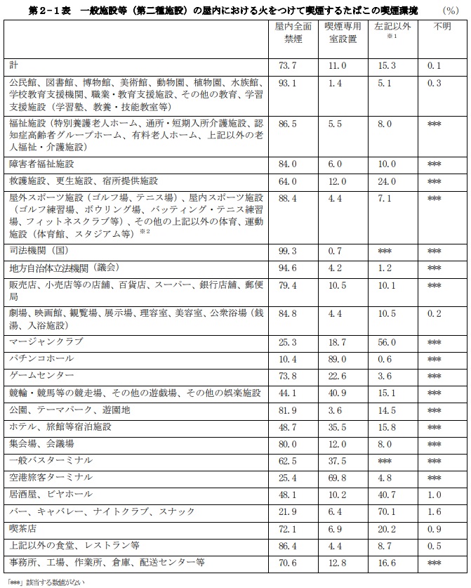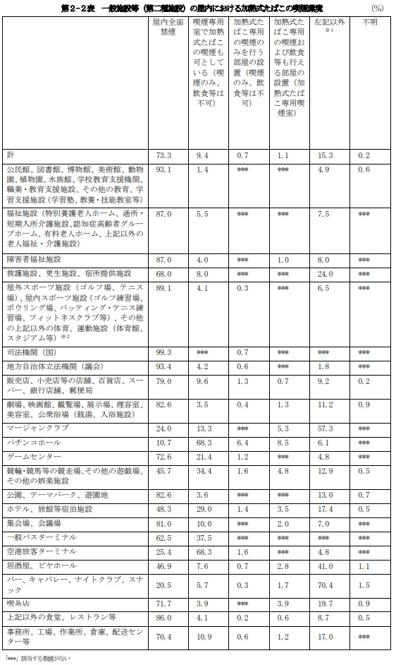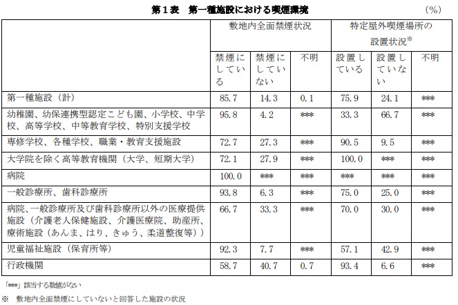 第一種施設の2023年度敷地内全面禁煙率が前年度比0.6㌽減の85.7%とわずかに悪化したことが、厚生労働省の調べでわかった。学校や病院などを除く第二種施設の屋内全面禁煙率も同0.4㌽減の73.7%で、受動喫煙対策が停滞している可能性を示す。