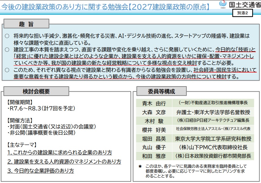 将来的な担い手不足や激甚化する災害、AI・デジタル技術の進化、スタートアップの隆盛といった建設業が直面する課題や変化を整理。人的資源をどう確保・配置・マネジメントすべきかが論点で、企業評価の手法の具体化などを模索する。