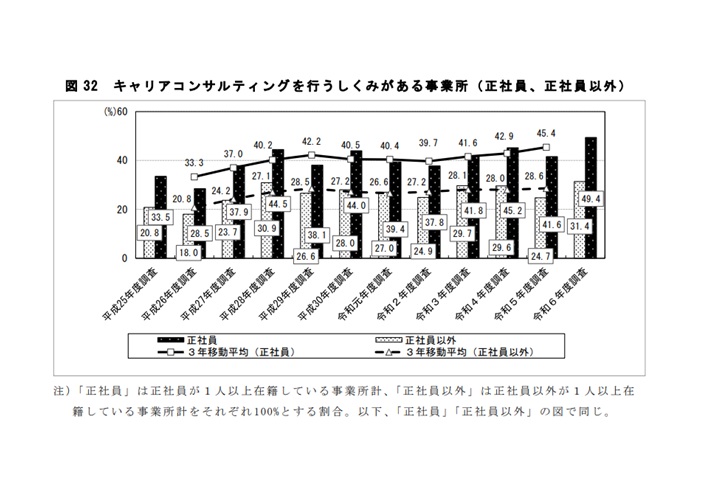 厚生労働省がこのほど発表した2024年度能力開発基本調査によると、「正社員にキャリアコンサルティングを行う仕組みがある」事業所割合は49.4%と5割弱となり、前年度比7.8㌽増と大幅に上昇した。