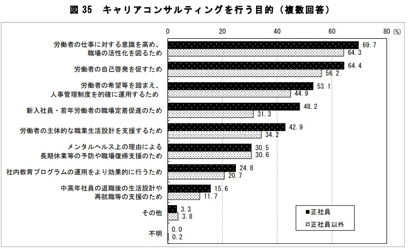 キャリコンの目的は、「仕事に対する意識を高め職場の活性化を図るため」が69.7%と7割弱で最多。