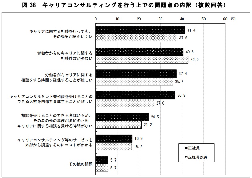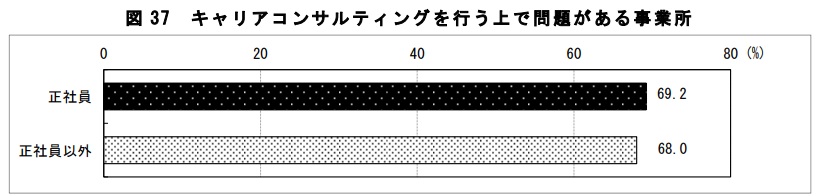 一方、69.2%が「問題がある」と指摘し、具体的には41.4%の「キャリア相談を行っても効果がみえにくい」、40.6%の「相談件数が少ない」、37.4%の「相談時間の確保が困難」の順で多かった。