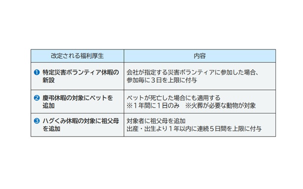 まず災害に対する人的支援を推進するために、会社が指定する災害ボランティアに参加するごとに3日を上限に休暇を付与する「特定災害ボランティア休暇」を新設。また慶弔休暇の対象にペットの死亡時を、出産・出生1年以内に連続5日を上限に付与する「ハグくみ休暇」の対象に祖父母を追加している。